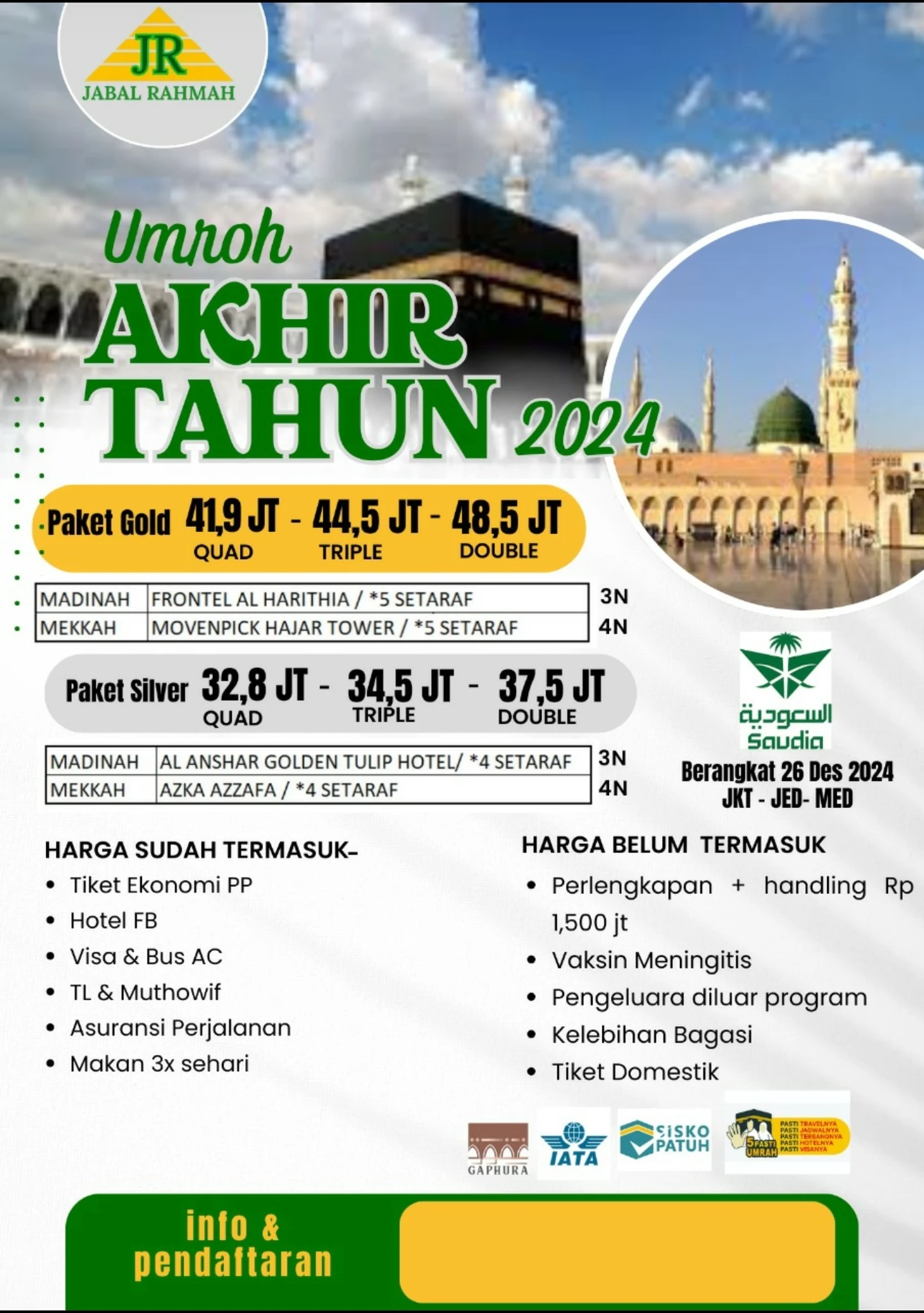 Rp, 35.000.000 @Program umroh full ramadhan untuk keberangkatan tahun 2025, anda dapat melihat paket yang kami tawarkan dengan harga terbaik...